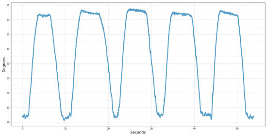 For better understanding, the scale was inverted, with 90° representing the thigh and shin aligned perpendicularly and 0° when the leg is fully extended. Thus, it becomes more evident after the five times that the volunteer raised his leg, remained elevated, and lowered it repeatedly for approximately 10 s.