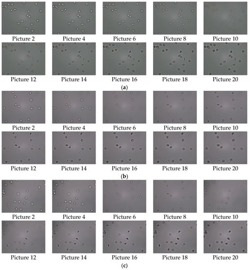 In order to make the experiment more rigorous and the algorithm more effective, 10 groups of defocus–focus–defocus urinary sediment cell images with 800 × 600 pixels are taken as test samples under the condition of 40X microscope amplification, with the object distance adjusted. Each group contains 19 to 22 images. In this study, four sets of experimental images and results are presented, and 10 of them are listed, as shown in Figure 4. The sharpness evaluation value of each image is calculated in MATLAB and plotted into a sharpness evaluation function curve. In addition, in order to analyze and view the results more conveniently and intuitively, this study normalizes all the results, as shown in Figure 5. The non-subsampled contourlet transform (NSCT), Tenengrad algorithm [29], Roberts algorithm [30,31], discrete cosine transform (DCT) [32,33], energy of gradient (EOG) [34] algorithm, Canny algorithm [35,36], and Laplacian algorithm [37,38] are selected for this comparative experiment. The Tenengrad algorithm uses a Sobel [39,40] operator to extract gradient values in horizontal and vertical directions, and then calculates the gradient square sum of all pixels. In addition, since the datasets involved in the experiment are small in size, the deep learning method cannot be used for comparative experiments. Therefore, no introduction will be made to deep learning in this study.