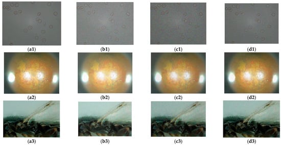 While obtaining an image, microscopes often produce some noise due to environment and equipment problems. In order to precisely analyze the advantages and disadvantages of the experimental algorithm as well as its noise immunity performance, this study adds Gaussian, salt-and-pepper, and Poisson noise. After the noises are added, the images are processed via a bilateral filter and guided filter in order to enhance the anti-noise performance of the algorithm. The images with noises are shown in Figure 7, and the results have been normalized. The normalized curves are shown in Figure 8. The images’ normalization curves for the public dataset are shown in Figure 9. The images’ normalization curves for the biomedical cell image sets are shown in Figure 10.