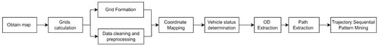 This study will use the Microsoft T-drive data, which contains the raw GPS trajectories of 10,357 taxis in Beijing, China, between 2 February 2008 and 8 February 2008 [11,12]. There are 15 million GPS recorded trajectories, adding up to 9 million kilometers. The dataset is a good representation of typical real-life trajectory records. Table 2 below gives an example of the trajectory data. Figure 1 briefly overviews the whole data processing procedure to prepare trajectory data for subsequent sequential pattern mining. The process started with obtaining the map data of the study area. The study area needed to be divided into grids with user-defined grid sizes for trajectory segmentation. Based on the size of one grid, it was possible to calculate the total number of grids required to encompass the study area. With the size of the grid and the total number of grids, grid formation was performed to calculate the geographical coordinates of the center of grids such that the grid center coordinates can represent any GPS point within the grid. At the same time, raw trajectory data must be cleaned and processed to remove unwanted trajectories. Detailed procedures for data cleaning and preprocessing were elaborated in the following sub-sections. When trajectories and grids were ready, it was possible to map all GPS points within the trajectory to grids to represent GPS sequences coordinated with a series of grids. The next step would be determining the status of the taxi considering the events such as parking, shift change, and traffic congestion. In these scenarios, vehicles would be in a stationary position. This step is crucial for determining a trajectory’s origin-destination (OD extraction) and subsequent path extraction, as data was recorded continuously throughout the period. The above steps prepared the data for subsequent sequential pattern mining.