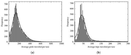 Taxis may be running, parking, or waiting for traffic. Here, it must be noted that when the taxi is in a prolonged stationary state suggests a change of shift or is in offline status. In this case, only trajectories between two parking events are wanted, and time spent waiting for traffic should be distinguished from parking events. The first step is to identify moving events between two parking events. Based on the pre-processed data, where the status of each record is marked as 1 or 0, if a taxi remains in the same grid for 10 min or more, it is considered as parking and marked 0. Finally, each taxi’s origin-destination (OD) data for each trip is extracted. Each record, instead of the taxi’s location at each timestamp, had become a single trip made by the taxi. There are at least 10 minutes of stationary phase between each trip. Each row consists of the Taxi ID, start time and end time of the trip, the grid ID of origin, and a list of locations in the form of grid ID involved in the trip. The final dataset contained 592,982 trips traveled by 10,226 vehicles. Figure 2 shows the frequency distribution of grids and trips traveled per taxi, respectively. Overall, taxis traveled an average of 187.66 grids and 57.98 trips during data collection.