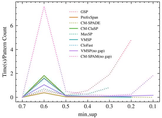 However, judging the algorithm’s efficiency simply through runtime or the number of pattern outputs was unfair. Figure 3 depicts algorithm efficiencies using runtime per pattern. When compared to algorithms that found a similar number of patterns (i.e., VMSP (no gap) and CM-SPAM (no gap)), GSP performed better at most , particularly at 0.6, 0.3, and 0.2. As a closed-constrained algorithm, CM-ClaSP was the second most efficient algorithm besides GSP at a of 0.6, while MaxSP became the second at a lower of 0.3. CM-ClaSP was the best-performing among algorithms without constraints. However, MaxSP and GSP failed to complete the task as was further reduced. Therefore, at low , CM-SPAM (no gap) became the most efficient algorithm.