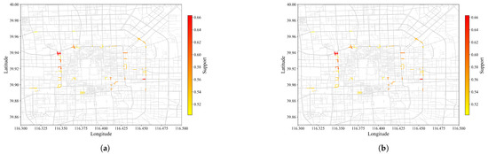 Output of SPM ( = 0.2) against Beijing road map. (a) Without constraint (b) With constraint. Color changes from yellow to red as support increases. Higher support suggests more vehicles trajectories overlapping at the particular road segment.