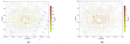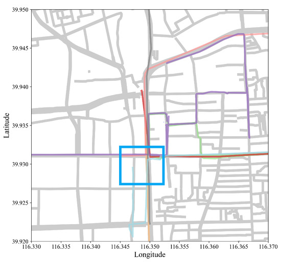 Figure 4 and Figure 5 visually compared SPM results at of 0.2 and 0.5, with and without contiguous constraints plotted against actual roads of Beijing. Results from CM-SPADE and CM-SPAM were used, respectively. At of 0.2, the outputs of three algorithm groups, non-constraint based, closed constraints, and max constraints, fall in the range of 7628 to 8068, except for GSP, which produces a very concise result similar to that of contiguous constraint algorithms. Contiguous constraints give an exceptionally low output count, which makes the comparison meaningful. Higher support denoted that more vehicle trajectories traveled on the road segment. A red-colored road segment suggested a large volume of vehicles. CM-SPADE was selected for visualizations, representing the results of algorithms producing outputs within the 7628 to 8068 rang. Results were distributed within the 3rd Ring Road, which is a city ring road that encircles the center of Beijing. The solid red box outlined in blue in Figure 5b is one of the sequential patterns mined. The road segment in the blue box is the junction between the West Second Ring, which is notorious for traffic congestion in Beijing, and Chegongzhuang Road. Figure 6 exemplified the SPM result by plotting some trajectories that supported the pattern boxed out. The same road segments were found in these trajectories. Trajectory pattern mining tries to mine for repeated patterns, such as frequently traveled road segments. More overlapping trajectories give more support.