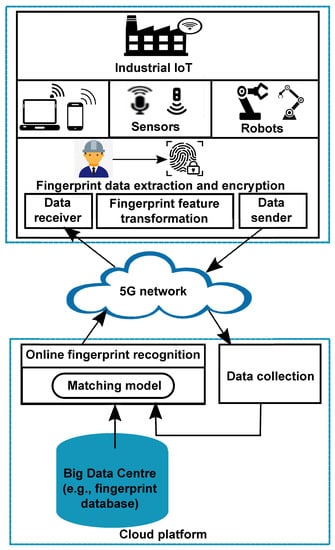 To address the above issues, in this paper we propose a secure online fingerprint authentication system for IIoT devices over 5G networks. The proposed system features the design of a cancelable fingerprint template, which protects original fingerprint minutia features and therefore provides privacy and security guarantee. To take advantage of 5G’s high-speed transmission and the cloud’s powerful processing capability, the proposed authentication system carries out online fingerprint matching in the encrypted domain in the cloud server. Compared with state-of-the-art methods, the proposed authentication system shows competitive performance on six public fingerprint databases, while saving computational costs and achieving fast online matching. Figure 1 shows the architecture of the proposed fingerprint authentication system. Note that the proposed system is not confined to 5G networks because the architecture of our system suits both 5G and non-5G networks. It is worth mentioning that the desired features of 5G networks improve the speed of online matching, thus increasing the efficiency of the proposed system.