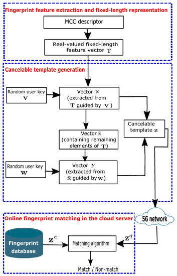 In this section, we propose a secure online fingerprint authentication system for IIoT devices over 5G networks. The core of the proposed system is the design of a cancelable fingerprint template. Figure 2 illustrates the block diagram of the proposed authentication system, which is made up of three steps. The first step is fingerprint feature extraction and representation, where a real-valued, fixed-length feature vector is extracted based on the method in [16]. Since this fixed-length feature vector contains the original minutia information, to protect it, we develop a cancelable fingerprint template in the second step. In the third step, the protected template is transmitted over the 5G network and online fingerprint matching is conducted in the cloud server.