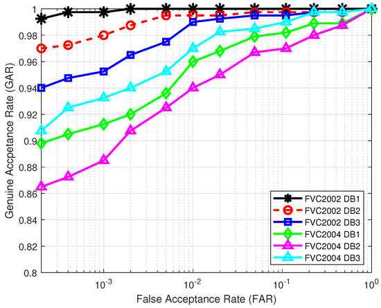 First, we plot the receiver operating characteristic (ROC) curves in Figure 3 for all the six databases in the lost-key scenario, with the key length of and set to . The MCC-based real-valued, fixed-length feature vector in (1) is of length , so is the maximum allowed length to satisfy . We observe from Figure 3 that among the six databases, the proposed authentication system shows the best performance over database FVC2002 DB1 and the worst performance over database FVC2004 DB2. Such performance is attributed to the high quality of fingerprint images in FVC2002 DB1 and the poor quality of fingerprint images in FVC2004 DB2.