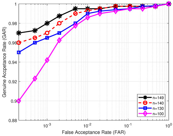 Next, we evaluate how the key length affects the performance of the proposed authentication system. In our cancelable template design, there are two randomly generated user-specific keys and , both of length n. User key is responsible for extracting elements from the original MCC-based real-valued, fixed-length feature vector so as to form the vector in (4). User key is in charge of extracting elements from vector in (5) to produce vector in (6). To assess the impact of key length n on the performance of the proposed system, we vary the value of n from large to small. Table 2 illustrates the effect of different key lengths on the matching performance in comparison with the baseline, that is, the unprotected real-valued MCC-based features with fixed-length . It can be seen from Table 2 that for all the databases, EER worsens when the key length n decreases. This is because a small value of n makes the original MCC-based feature vector contribute less to the resultant cancelable template than a large value of n. Figure 4 shows the ROC over database FVC2002 DB2 for different key lengths.