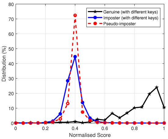 In this section, we evaluate the revocability and diversity of the proposed authentication system. Revocability and diversity are considered important properties of cancelable biometrics, which require that if a stored template is compromised, it can be replaced with a new template by altering the user-specific key. The new template and the compromised template should be completely unrelated. To examine the revocability and diversity of the proposed system, we produced 100 transformed templates from the first impression of each finger in database FVC2002 DB2 by randomly generating different user keys and . These pseudo-imposter templates were matched with the original ones. The genuine, pseudo-imposter and imposter distributions are plotted in Figure 5, which shows that the pseudo-imposter and imposter distributions largely overlap. Their mean and standard derivation are very close to each other, given by the mean 0.3902 (pseudo-imposter) and 0.3913 (imposter), and standard derivation 0.055 (pseudo-imposter) and 0.053 (imposter).
