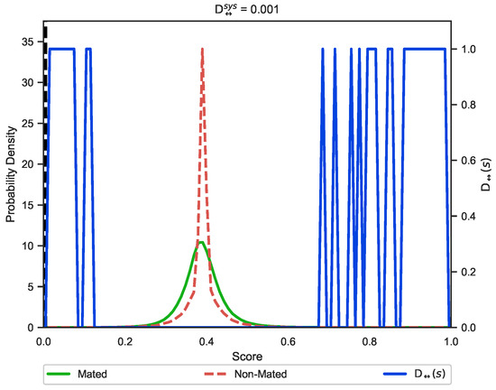 Two unlinkability measures, score-wise linkability and system overall linkability , are defined in [28]. The score-wise linkability determines the amount of linkability of protected templates for each matching score s of mated and non-mated sample score distributions. Thus, for a specific score s, means that two templates are fully unlinakble, while means that two templates are fully linkable. The intermediate values between 0 and 1 indicate the degree of linkability at specific matching scores. On the other hand, the system’s overall linkability estimates the linkability of the entire template protection system, independent of matching scores. When (or ), the template protection system is fully unlinkable (or fully linkable).
