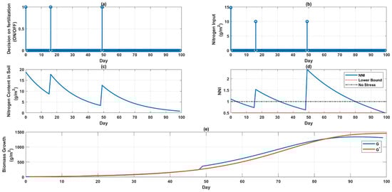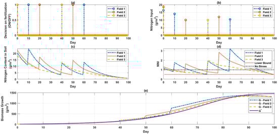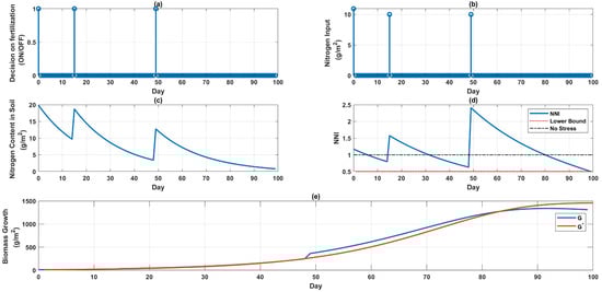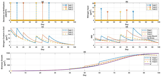 Figure 2 shows the simulation of the total 100 days. It can be seen from Figure 2a that on the 1st, 16th, and 51st days, fertilization is required for targeting the maximum growth, taking into account the labor and resource costs. Figure 2b indicates the quantity of the fertilizer needed to be applied on AOI for these days; on the 1st, more fertilizer should be applied to obtain the maximum biomass growth. Figure 2 and Table 2 may be used to make the decision. The simulation provided relates to the farmer prioritizing labor and fertilizer costs by considering , while also considering the highest biomass growth (with ).