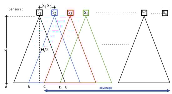 Figure 1 defines the different geometrical parameters to be taken into account to optimize the system: a series of sensors (Si) is located at a distance (d) from the study area. For each sensor, the field of view (FOV) is expressed as a function of the distance (d) and the angle of view () by the relation: