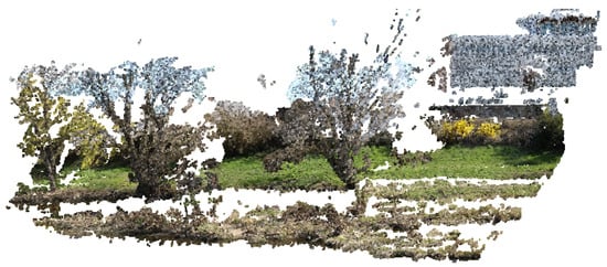 These tests allow us to conclude on several points. First, they validate the calculation of the minimum number of sensors allowing the realization of the photogrammetric model. Under these conditions, at a distance of 6 m, we obtain a density of 13,154 points per m, that is to say, approximately 1 point per cm, which makes it possible to describe topo-environmental variations with a very high degree of precision. At a distance of 12 m, the resolution decreases by 2763 points per m or about 1 point per 5 cm. These resolutions are still very high compared to those obtained with more traditional methods, such as airborne LiDAR or aerial photogrammetry, which provide a maximum resolution of about 4 points per m [17] and confirm the ability of our device to analyze acceptable variations, but at a tiny scale. At the same time, LiDAR surveys allow only a macroscopic analysis but at a much larger scale. However, it should be noted that the resolution of our system decreases rapidly with distance. Depending on the constraints of the terrain, it will be necessary to be vigilant to this parameter, which will potentially significantly influence our results’ accuracy. As previously indicated, the purpose of our system is to focus on close monitoring of small areas of interest, which is validated by these first results. We also observe that adding image sensors regularly interspersed between the previous ones significantly affects the final resolution of the 3D model. Thus, by multiplying by four the number of sensors deployed, the resolution is multiplied by 5.2 at a distance of 6 m and 11.5 at a distance of 12 m. This observation validates the chosen strategy of using low-resolution sensors to design photogrammetric models. Suppose the model’s resolution obtained with the minimum number of sensors is insufficient. In that case, it will be possible to increase it by adding additional sensors, with, of course, the disadvantage of increasing the cost and energy consumption of the whole. A compromise must therefore be found between these different parameters.