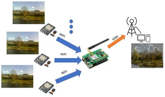 The total energy balance depends on the scenario adopted for data transmission. In our study, we have chosen to transmit the photos from the sensors deployed at the edge of the study area through a Wi-Fi connection. Wi-Fi has the advantage of having a modular bit rate that can reach essential values under the needs of the image transmission. Nevertheless, this type of network is often absent from areas of interest for environmental photogrammetry, and its maximum range of about 250 m outdoors does not allow to follow the behavior of an area at a distance. The choice was therefore made to use a transportable relay allowing the sensor nodes to connect to the Wi-Fi, which will centralize the images before transmitting them on another long-range network such as GSM, as shown in Figure 6.