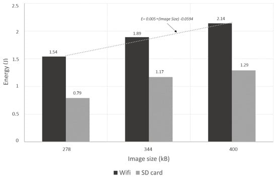 To determine the energy for both scenarios, the power consumption for saving an image to an SD card and transmitting the same image via Wi-Fi was measured. The results of the measurements are given in Figure 7. However, for each of them, the energy of the operation is related to the image size (thus to the amount of data saved or transmitted).