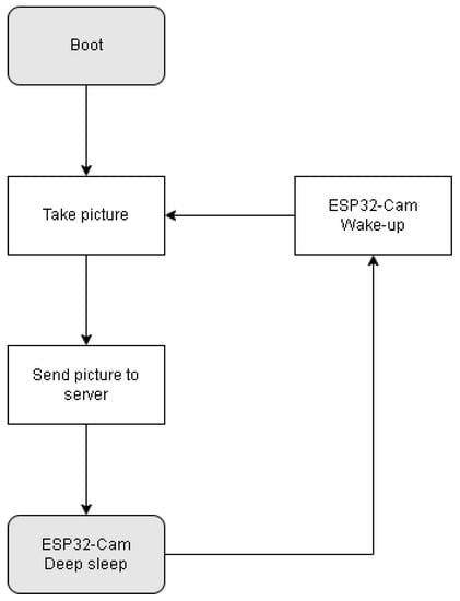 Communication with the RPi server allows the ESP32-Cam’s sleep time to be set. Figure 10 shows the power consumption of a complete cycle with two photos taken. The duration of the sleep mode was 5 min on this measurement.