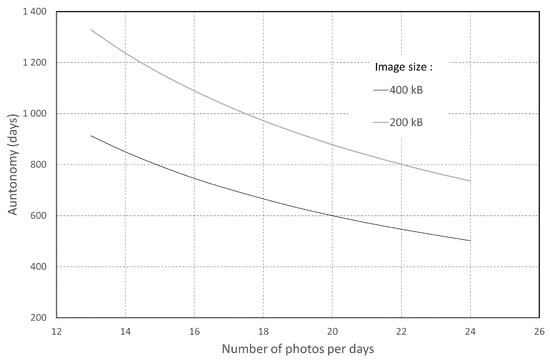 Estimation of the autonomy according to the number of pictures taken for 2 different image sizes (200 and 400 kB).