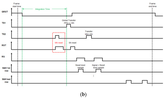 The closing of the Global Shutter Reset (GRST) marks the start of the integration time, where the PPD is floating (not connected). The end of the integration time is achieved by operating the Global Transfer Gate (TX1) and transferring the signal electrons simultaneously to the memory node (MN). Prior to that, the MN is reset, as well as the SN. The reading is achieved by electronic scanning and is therefore row-dependent. The rows are scanned, and the second transfer gate is briefly operated, transferring the signal electrons to the SN node. Accordingly, the storage time of the memory node depends on the row. The reading of the signals with the source follower then follows exactly as in the four-transistor-APS (of Figure 1).
