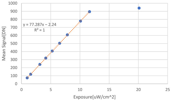 The monochromator generated a beam at the wavelength of 550 nm. A total of 100 frames were taken from the DUT sensor, from which the mean and variance were extracted. Figure 5 shows the measurement results under illumination. The slope is 0.0828 [DN/e]. The Conversion Gain extracted from the measurements using Model Case I is 6 [e/DN], and, using Model Case II, it is 12 [e/DN].
