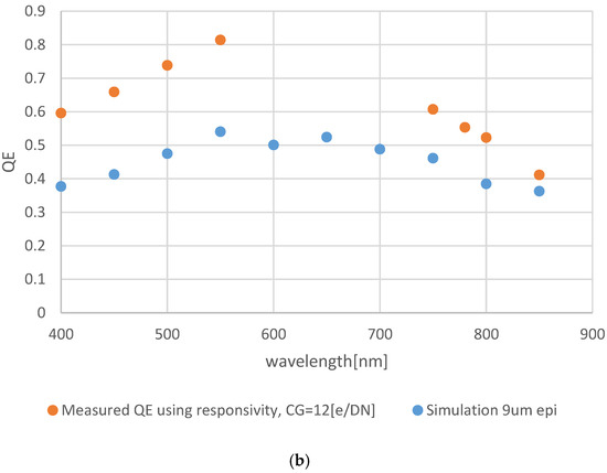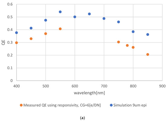 From the comparisons, the QE using Model Case I provides reasonable values that match the simulation. As expected, the simulation is quite higher than the measurements using Model Case I. By using Model Case II, the simulated results are lower than the measured results, which is non-physical. During measurements, not all photo-carriers are collected by the PPD, and, hence, the simulated results should be higher.