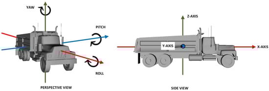 Every element along the kinematic chain has a set of rotation axes associated with it. The origin of the local axes corresponds to the rotation pivot of the element under consideration. At the same time, sensors placed on the equipment components record the rotation with respect to a set of global axes that are common for all the elements comprising the equipment. Thus, there exist a set of global axes as shown in Figure 3. These axes are familiarly called the X-, Y- and Z-Axes, and are defined such that X-Axis points in the horizontal direction to the right, Y-Axis orthogonal to the plane defined by X- and Z-Axes and in a direction pointing away from the reader, while the Z-Axis points in the vertically upward direction. The three commonly used terms to describe rotation of a body in 3-dimensional space are roll, pitch, and yaw. Roll is the rotation experienced about the X-Axis, pitch is the rotation about Y-Axis, and yaw is the rotation about Z-Axis, as shown in Figure 4.