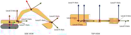 Due to such rotation and translation of individual components, the position and orientation of the local origin of the coordinate axes gets altered. This results in a change in direction of local X, Y, and Z axes. For example, rotation of the boom component in an anti-clockwise direction results in corresponding rotation of the stick and bucket components by the same magnitude. Due to this, the local axes direction of X, Y, and Z differ from their global directions, i.e., directions corresponding to zero translation and rotation. This is represented in Figure 6, through side and top views of an excavator.