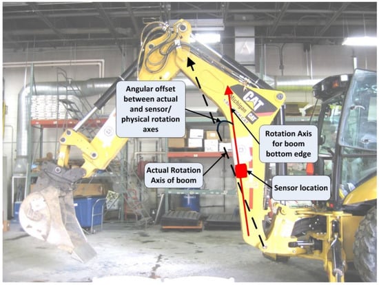 The effect of kinematic non-equivalence is most evident in the case of objects having curved bodies or objects having bends in their physical makeup, such as booms and sticks/dippers. In such objects, these physical characteristics result in differences between the axis corresponding to a certain edge and the pivot-to-pivot rotation axis. For most equipment components, the sensors are often placed along an edge of the body, as shown in Figure 7, to ensure its position remains fixed during the course of operations, and the sensors record the angle of a known edge in the real world.