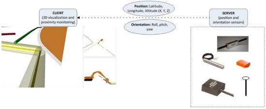 The two key requirements are enabled through a server-client approach to equipment monitoring. The server refers to the part of the framework that is responsible for recording and transmitting real world sensor data in an appropriate data format to the client. The client, in this case, equates to the digital twin, i.e., 3D visualization and proximity monitoring algorithms that would consume the real-world sensor data. Insulation of the client from the sensors used on a jobsite ensures that the visualization and proximity monitoring are not restricted by the type of position or orientation sensors that may be implemented. In addition, this arrangement also allows multiple sensor data streams to be made available for the client.