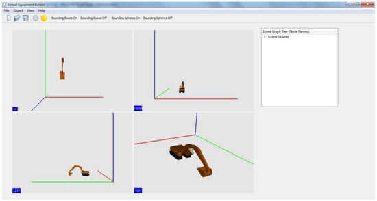 VEB is designed as a graphical interface that allows users to load individual equipment components as child (or parent) elements of other components, and thus build up a complete equipment 3D model in the process. The complete equipment model can be saved for use in the SeePlusPlus real-time 3D visualization system. VEB is designed and developed as an interactive tool that allows users to manipulate the view, as well as change the position and/or orientation of components, while creating the complete equipment model. A screenshot of VEB with a created 3D excavator model is shown in Figure 11.