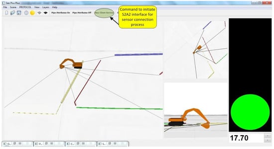 SeePlusPlus is a 3D visualization system that provides users with visual guidance, and also has an associated proximity monitoring and collision detection module. However, for the virtual world in SeePlusPlus to be representative of real-world operations, a user requires a method to connect real world sensor data to equipment components that make up the 3D equipment models. Figure 12 shows a screenshot of SeePlusPlus displaying a concurrent scene with an excavator and buried utilities. The terrain is rendered translucent to enable visualization of otherwise occluded utilities. Proximity monitoring in the scene is displayed to the user through three channels. First, numerical shortest distance to collision; second, lines drawn between bucket and utilities; and third, traffic signal colors-based warning, showing green, amber, and red for varying levels of safety and accident risk. Figure 12 also highlights the user command to activate the sensor connection interface for making the sensor data stream available from the S2A2 framework.