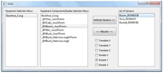 In a similar manner, the rotation can also be specified by choosing one or more of roll (Rotate X), pitch (Rotate Y), and yaw (Rotate Z). Once an equipment component has been allocated a sensor stream, its position and/or orientation is updated in real-time, as long as the sensor in the real world is active and transmitting data. Thus, the S2A2 interface is designed to work together with the SeePlusPlus real-time 3D visualization application in providing real world sensor data to update the corresponding 3D equipment models. This is necessary to enable the monitoring of operations and improve safety.