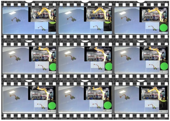 Images captured from a simultaneous video recording of the validation experiment showing backhoe in the real world and the digital twin.