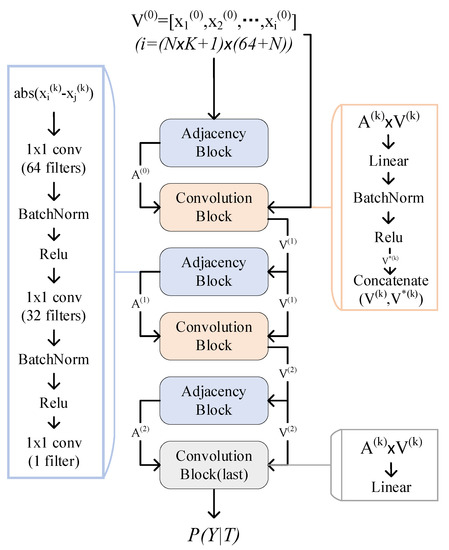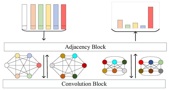 - Convolution Block: The new nodes are obtained by a graph convolution neural network, which is formulated as follows:where is a nonlinear activation function, is a learned parameter, and is the matrix of features.