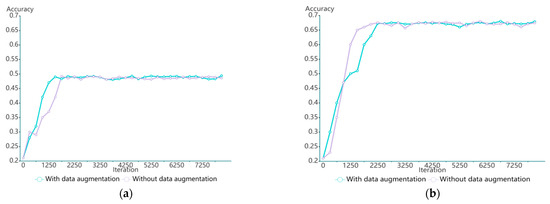 In general supervised learning, when the number of training samples is insufficient, the supervised learning model could easily have an overfitting problem. To solve this problem, some data enhancement operations such as random cropping, mirroring, and resizing are usually performed to increase the number of training images. Similarly, the proposed task-oriented model with insufficient training tasks will also suffer from the overfitting problem. We also tried to perform data enhancement in our experiment to achieve a better performance, but the experimental results were not satisfactory. The method is referred to as “GNN+Pre-training (meta-learning) + Enhancement” in Table 3. As shown in Figure 7, after adding data augmentation, the model converges slightly faster than before, but the accuracy is not improved. The reason is analyzed as follows: Unlike general supervised learning, where the number of training samples plays an important role, for task-oriented learning, the more training samples, the better the performance. However, for the few-shot problem, it is difficult to increase the number of training categories, and task expansion may not be effective.