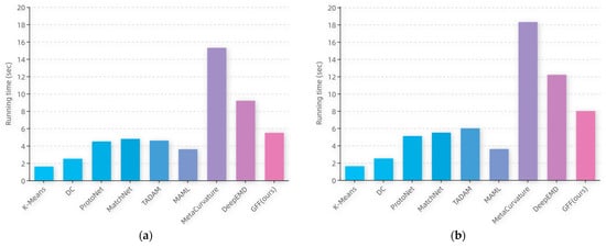 The running time of a single sample test phase for different methods in (a) the 5-way 1-shot case and (b) the 5-way 5-shot case.