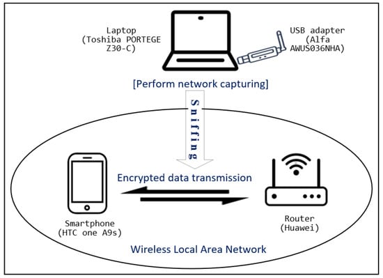 In this research, the network was monitored passively, and the network traffic was captured without connecting to the WLAN to which the target user’s smartphone was connected. To this end, Airmon-ng and Airodump-ng sniffing tools from the Aircrack-ng [] suite was used to sniff the network traffic transmitted within a wireless network. Network adapters were set only to capture packets that were sent to them. Therefore, the network adapter was set to the monitoring mode to capture all traffic. Encrypted traffic was sniffed on the same WLAN channel as the access point. Figure 1 shows the experimental testbed used to sniff traffic. The smartphone was provided access to the Internet over a wireless connection via a router. To avoid other sources of interference, the smartphone was connected to the WLAN exclusively.