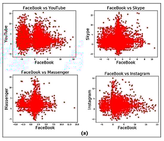 Looking at Table 6, the majority of the misclassified data was assigned to Facebook. More than 33% of the misclassified traffic from YouTube, Skype, Messenger, and Instagram test apps belongs to Facebook. The reason for this is shown in Figure 4a, where the correlation graphs of Facebook vs. those four apps are presented. In Figure 4a the points are closely packed. This means the strength of the correlation is high among these apps with Facebook, which has caused them to get misclassified as Facebook traffic. Facebook Inc.’s apps (i.e., Facebook, Instagram, and Messenger) use FB-Zero protocol. Most misclassifications occur when different applications share common patterns when being part of the same umbrella of services and relying on the same libraries and codebase. Applications from the same provider and sharing the same underlying protocols contribute to traffic misclassification.