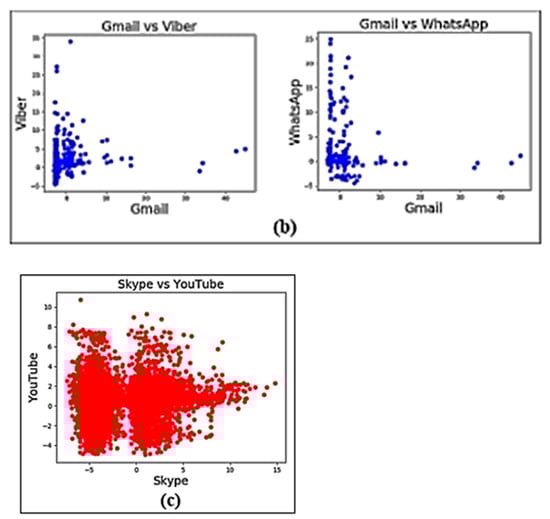 When Gmail is considered as the test app, only 9% of the unknown traffic was misclassified as previously trained class labels. One percent of the misclassified traffic was labelled as traffic belonging to WhatsApp, and another one percent were labelled as traffic belonging to Viber. This means that the lowest misclassified Gmail unknown traffic came from WhatsApp and Viber. On the other hand, when WhatsApp and Viber are considered as test apps, 2% of the misclassified traffic was labelled as Gmail. This is because of the inherently distinctive dissimilarities in the activities between Gmail-Viber and Gmail-WhatsApp. This means that the correlation of Viber and WhatsApp with Gmail is low. This has been demonstrated by the correlation graphs of Figure 4b. It can be observed that the points are distributed loosely which means the considered apps are only slightly correlated to each other.