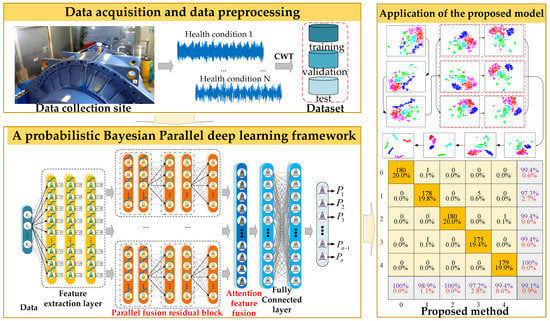 In this study, an uncertainty-aware approach is explored in a probabilistic Bayesian deep learning framework for reliable machine fault diagnosis. Traditional deep learning has the problems of difficulty in fault feature extraction and low performance in fault diagnosis. Therefore, a probabilistic BayesianPDL framework is designed for the bearing fault diagnosis of wind turbines. The overall process of the proposed method is shown in Figure 3.