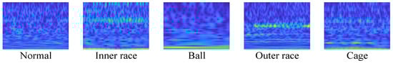 This experiment used five datasets and a total of five bearing states, including normal, inner race defect, ball defect, outer race defect, and cage defect. Among them, the inner ring failure is spalling, the failure of the ball and cage is worn, and the outer ring failure is electrical corrosion. Because the fault occurs at different times, the data are collected at different speeds. Detailed information on the dataset setting is shown in Table 1. As a time–frequency domain conversion method, CWT can effectively transform 1D vibration signals into 2D time–frequency maps which can be directly used by the convolution layers. Complex Morlet wavelet (cmor3-3), as a widely used WBF, is utilized in signal preprocessing. The bandwidth parameter and center frequency of the CWT are set to 3, and the length of the scale sequence is set to 128. The time–frequency feature maps are generated from the vibration signal, as shown in Figure 6.