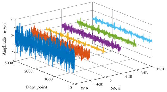 Figure 7 shows six different noisy signals. It can be found that different noisy signals have different amplitude characteristics. It can be seen from the figure that, as the SNR decreases, the vibration signal is obviously submerged in the noise.