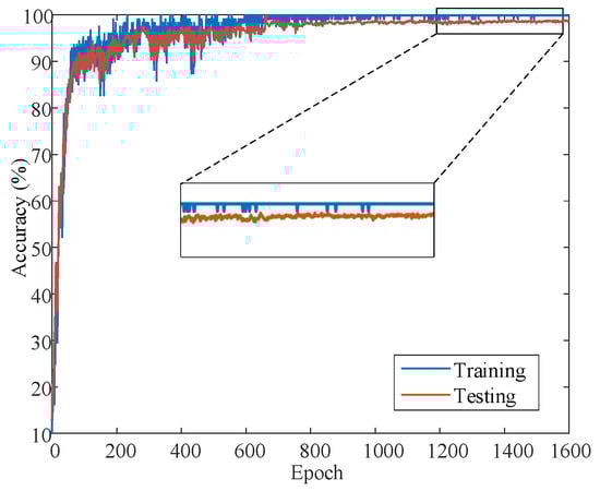 Take SNR = 0 dB as an example, and observe its training curve. Figure 9 shows the convergence curve of the network training process when the number of PFRBs is 3. It can be intuitively found that the convergence curves of training and testing have a good fitting effect. The curve stops converging when the accuracy reaches 99.14%. From the testing curve, it is found that the proposed method is satisfactory.