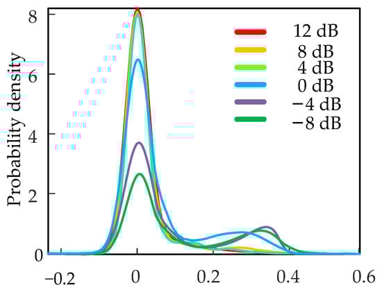 When PFRBs is 3, the uncertainty distribution of the network is shown in Figure 10. The probability density of the uncertainty distribution proposed method is significantly reduced due to the heavily disturbed noise on the signal at low SNR. This reduces the confidence of the diagnostic results and reduces the diagnostic accuracy. At higher SNR, the probability density is highly uniform with higher confidence. As SNR increases, so does the confidence of BayesianPDL, which gives high confidence in the diagnosis. Therefore, when the number of PFRBs is 3, the diagnostic results have the highest confidence and the highest accuracy, thus obtaining the optimal Bayesian PDL.