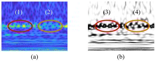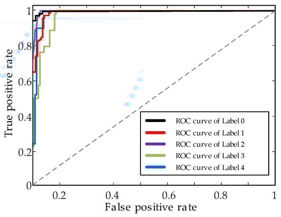 To further evaluate the predictive power of the model, receiver operating characteristic (ROC) curves of different fault labels are as shown in Figure 11. As a result, the BayesianPDL framework has a high fault detection capability. Figure 12 shows the outer ring fault features identified by the BayesianPDL framework. The input time–frequency feature map as shown in Figure 12a, and the features identified map by the BayesianPDL framework as shown in Figure 12b. The fault features of the outer ring are represented by feature (1) and feature (2), respectively, and the feature (2) is not obvious. However, the BayesianPDL framework can effectively identify fault features, such as feature (3) and feature (4), during the diagnostic process. This demonstrates that the proposed method has a strong feature extraction ability in the process of wind turbine bearing diagnosis.