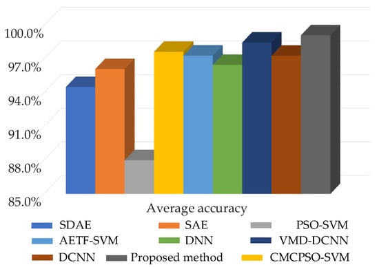 Comparing the literature [13,25] and traditional machine learning fault diagnosis methods with optimal BayesianPDL, the input signal of different diagnostic methods is the raw vibration signal. Among them, the PSO-SVM method and the CMCPSO-SVM method were obtained through the literature 13. The AETF-SVM method was obtained through the literature 25. Figure 13 shows the average diagnostic accuracy of different diagnostic methods. Compared with other diagnostic methods, the method proposed has the highest accuracy. However, the other methods are all non-probabilistic diagnostic models (the network is deterministic). When the diagnostic process with the confidence level cannot be obtained, this results in unreliable diagnostic results.