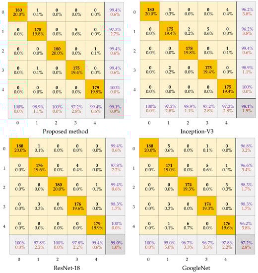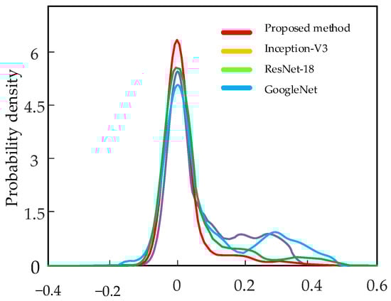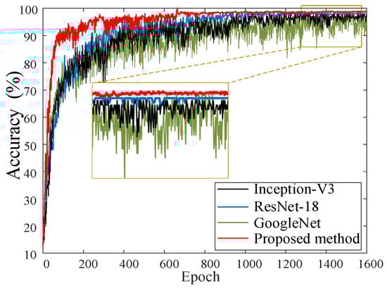 In the Bayesian deep learning framework, the Bayesian process can be flexibly transferred to other types of deep learning models. Compare the convergence performance of the optimal BayesianPDL framework with GoogleNet, ResNet-18, and Inception-V3 methods. The accuracy convergence curves of the raw signal input for different diagnostic methods are shown in Figure 14. It can be seen from the four convergence curves that the proposed method has the fastest convergence speed, the smallest curve fluctuation, and the best convergence effect. There are many fluctuations in the other three methods during the training process, which indicates that there may be problems such as gradient explosion during network fitting. The convergence curve of GoogleNet still has large fluctuations after the diagnosis, resulting in a diagnostic result of only 97.21%.