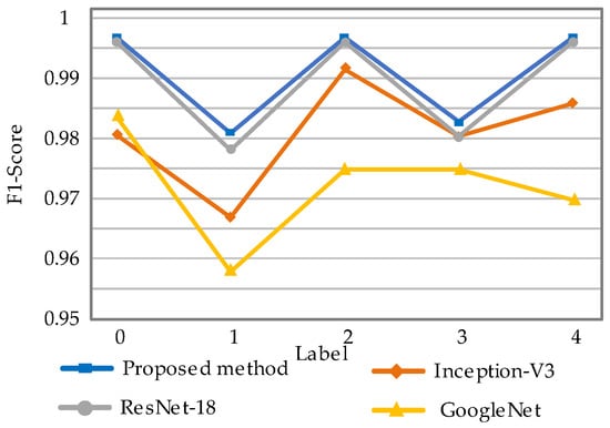 The uncertainty contributions of different diagnostic models are as shown in Figure 15. The proposed method has a higher probability density. This indicates higher confidence in the diagnostic results of the proposed method. The F1-score of the different fault labels is represented in Figure 16. It can be seen that the method proposed has the highest F1-score and thus the best quality of the model. The confusion matrix of the four models is shown in Figure 17. For each type of label, the method proposed has high diagnostic accuracy. Therefore, the BayesianPDL framework has superior diagnostic capability to other signal analysis methods.