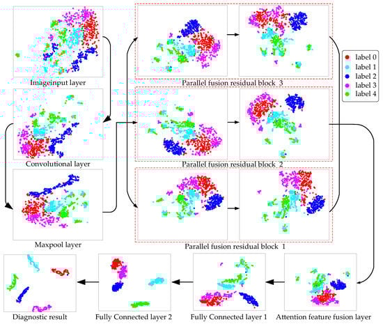 High-dimensional features are mapped to two-dimensional space by the T-SNE algorithm, as shown in Figure 18. The changes in data points within the optimal BayesianPDL framework are visually displayed by the T-SNE algorithm. As data points are entered, they cross each other and are distributed chaotically. With the continuous deepening of feature extraction, data points in PFRBs begin to be fitted and classified, and some features are separated. In the attention feature fusion layer, the data points are fused according to different attention values to achieve feature augmentation inside the network. The fault points are classified at the fully connected layer. All types of faults are classified clearly and the diagnostic results are obtained.