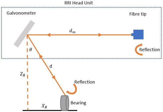 of the galvanometer scan (corresponding to the distance along the laser beam from the fiber tip at each instance). Based on the distance between the galvanometer mirror and the reflection and the galvanometer angle, the RRI head unit can be used to convert the polar coordinates into Cartesian coordinates using the geometrical relations given in Equations (5)–(7):