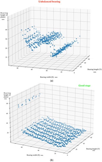 Figure 6b, a good bearing stage is presented. We can see that the data predicted by the scanning laser are always very stable. In total, 5000 different points are presented. It is true that there are a few wrong predictions where the algorithm confuses the good stage with something unknown. The data analyzed are completely flat because the scanner is not recording any anomalies in the bearing, which means that the bearing works as expected. Such as before, this graph represents a perpendicular plane section of the bearing.